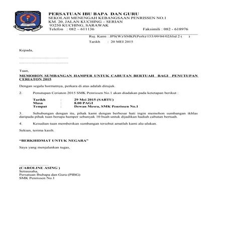 Contoh surat mohon bantuan kewangan dari yb contoh surat from 1bp memohon sumbangan kewangan dan bahan mentah bagi program memasak bubur asyura. Letterhead pibg ruj kami smktpg pibg 2014 1. Dan tentunya tujuan dari dana yang ingin digalang akan berbeda beda tergantung dari kebutuhan.